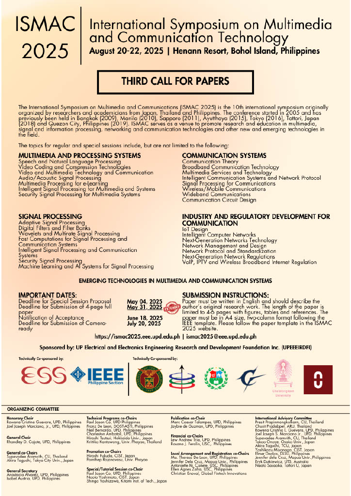 The IEEE International Symposium on Multimedia and Communications (ISMAC 2025) was held on Panglao Island in the Philippines for three days from August 20th to 22nd. Research papers were presented at this conference in the following specialized fields: (1) Multimedia and Processing Systems, (2) Signal Processing, (3) Communication Systems, and (4) Industry and Regulatory Development for Communication (see Figure 1).