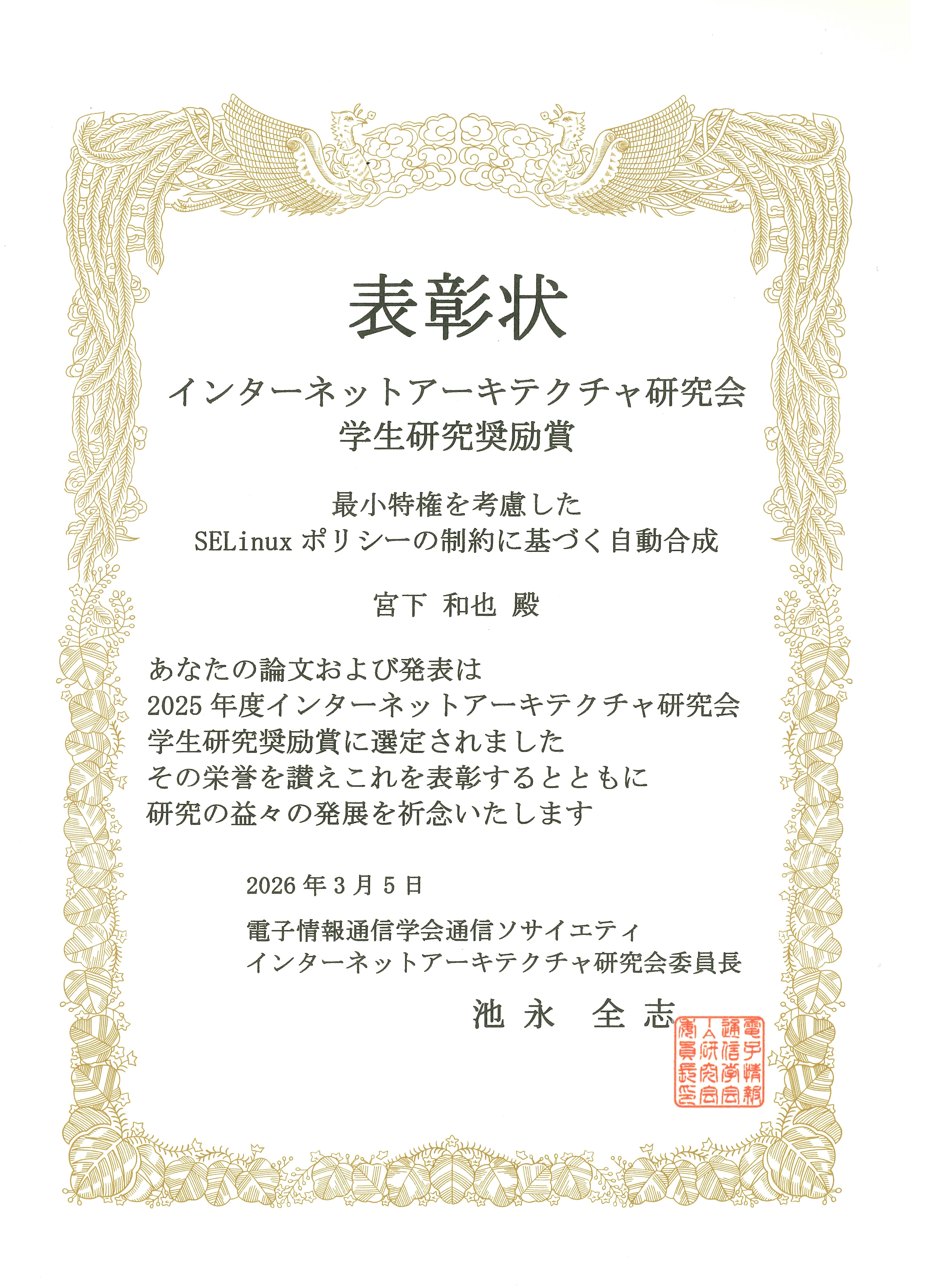 本学の学部生が、令和8年3月3日(火)から3月5日(木)に沖縄産業支援センターで開催された電子情報通信学会インターネットアーキテクチャ研究会にて、「インターネットアーキテクチャ研究会 学生研究奨励賞」を受賞しました。