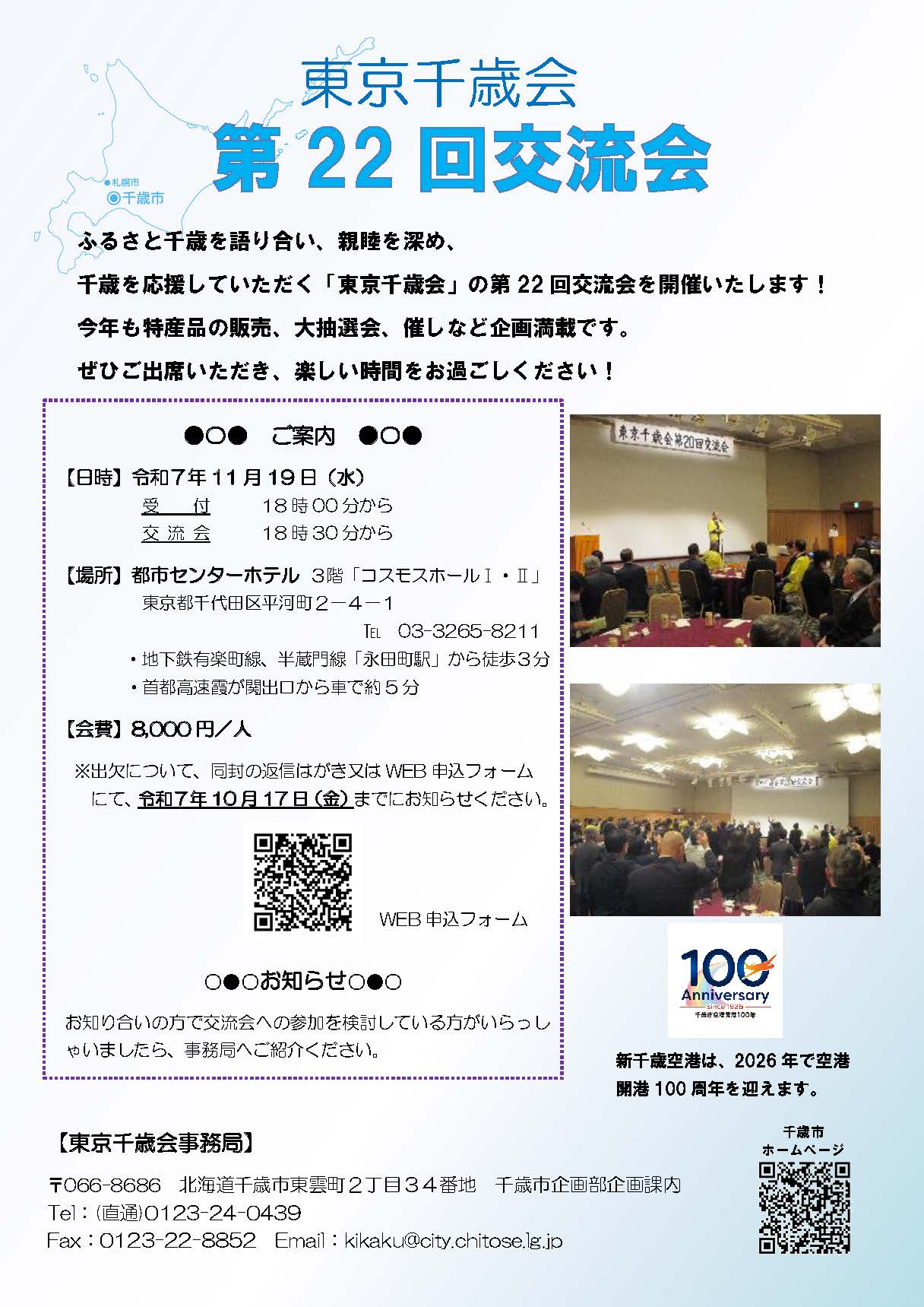 千歳市が主催し、毎年東京都内にて開催されている東京千歳会の第22回交流会が開催されます。ご多忙のこととは存じますが、この機会を通じて母校や千歳市の近況について懇談ください。