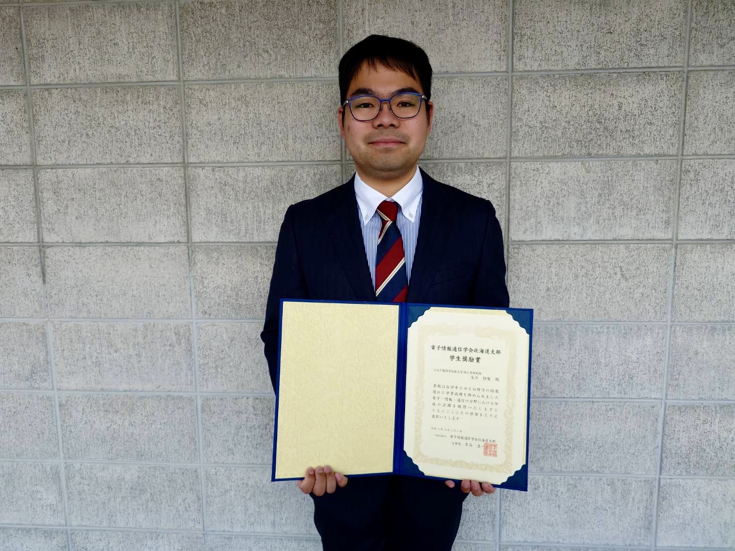 「電子情報通信学会北海道支部 学生奨励賞」は、電子工学および情報通信に関する学術または関連事業に関して今後の活躍が期待できる優秀な学生を対象に表彰される賞です。