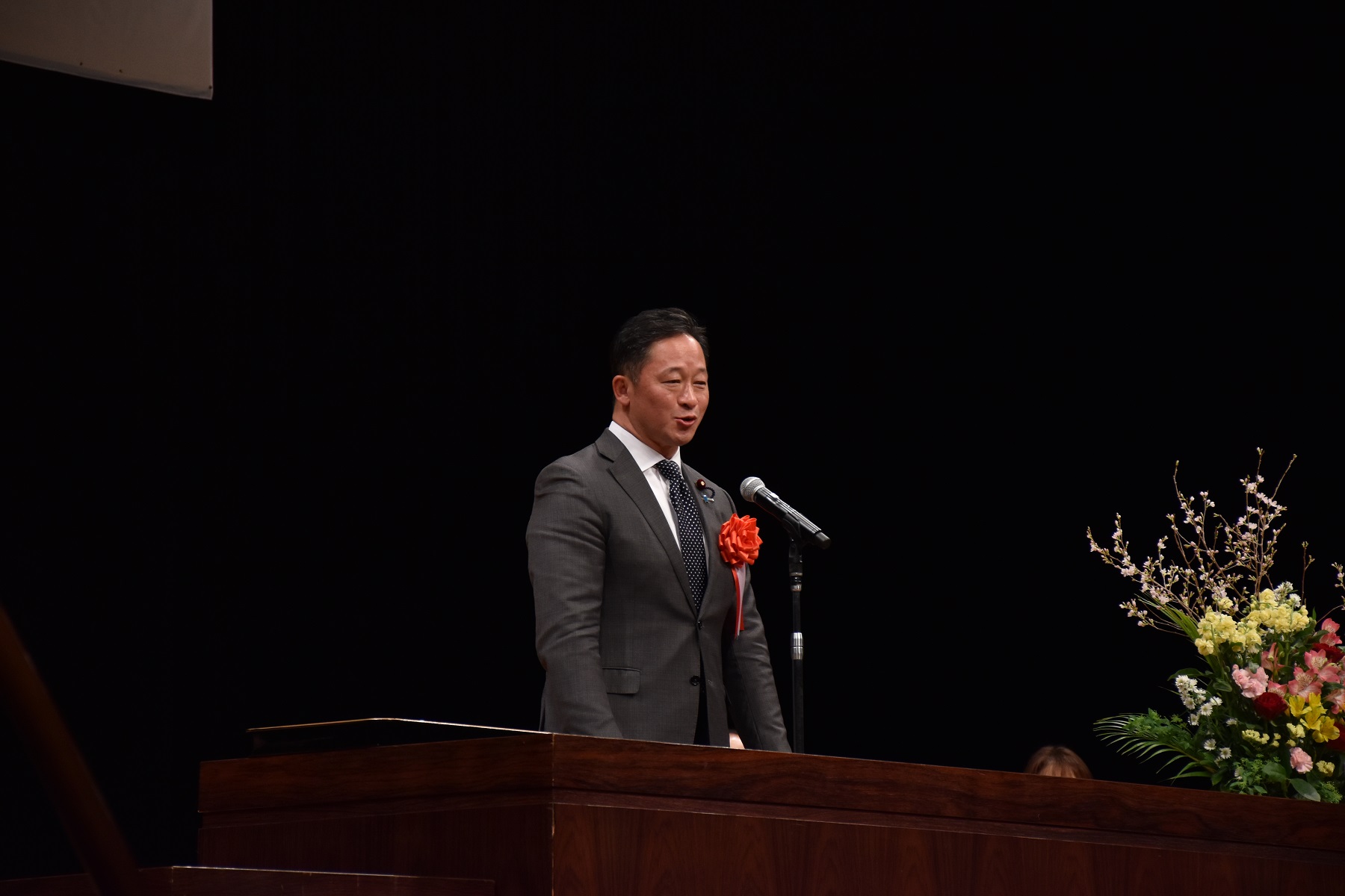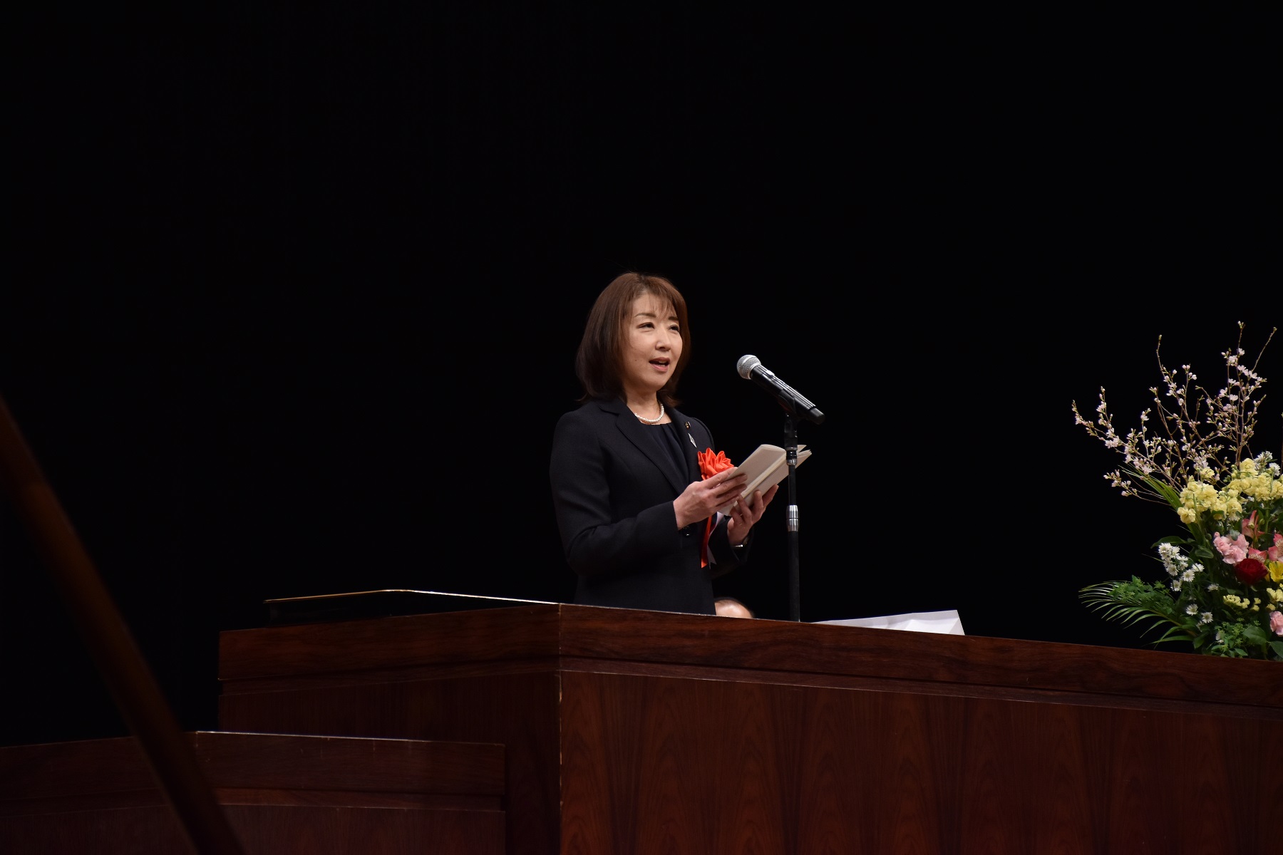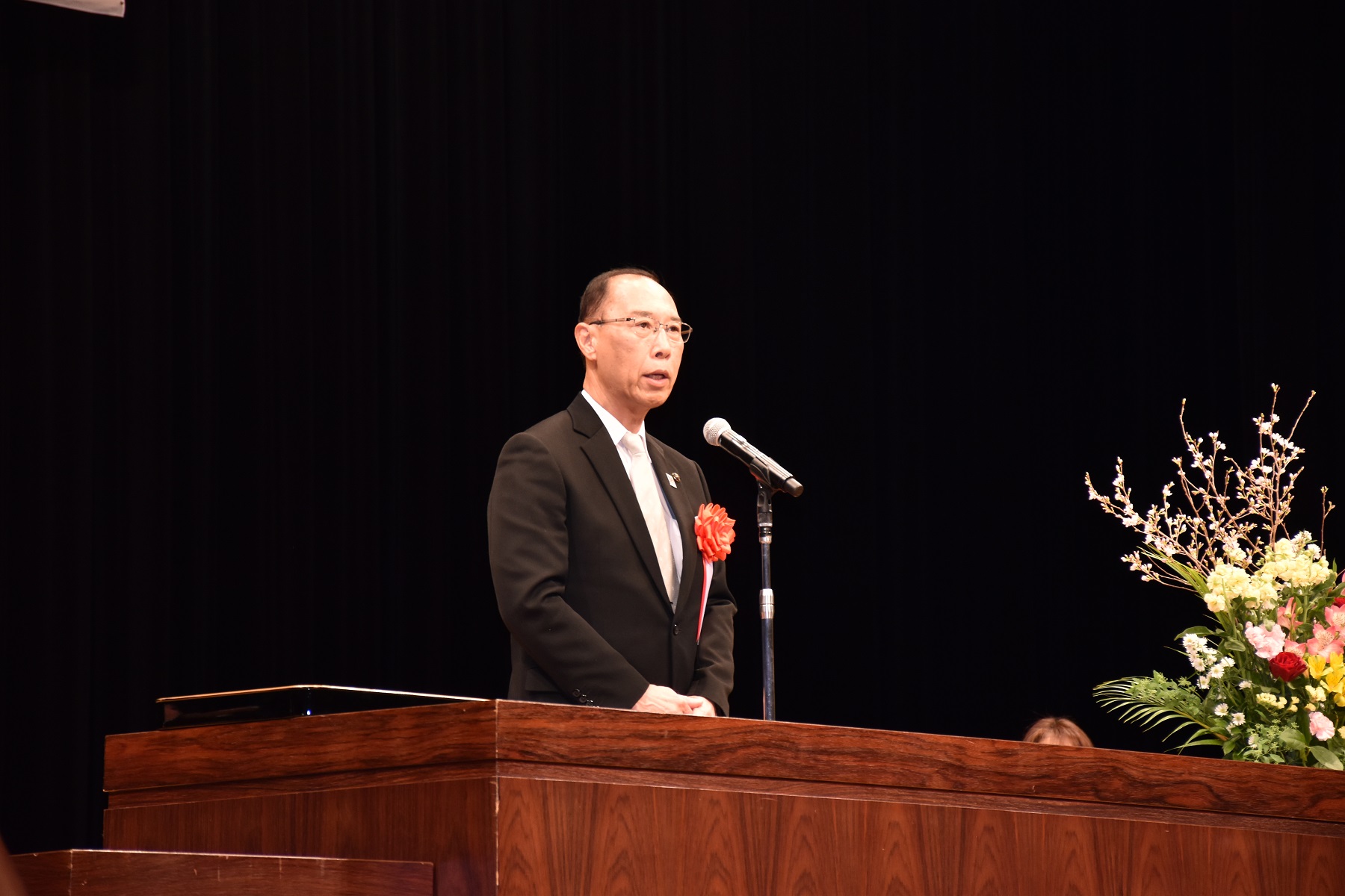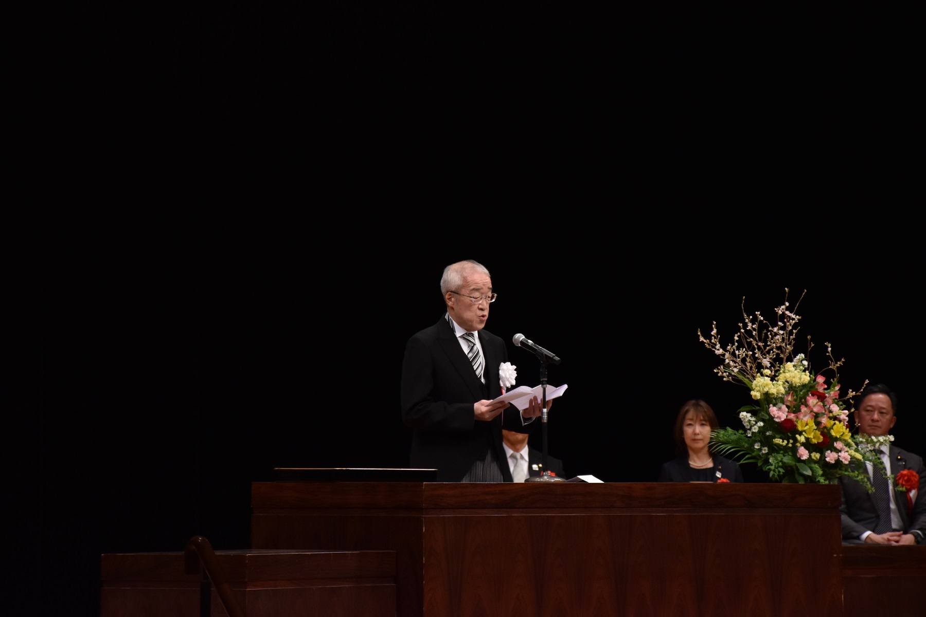 開式の辞の後、学部卒業生、大学院修了生の代表学生に宮永喜一学長より学位記が手渡されました。その後、学長式辞、横田隆一千歳市長、松倉美加千歳市議会議長、和田義明衆議院議員からそれぞれお祝いの言葉をいただきました。