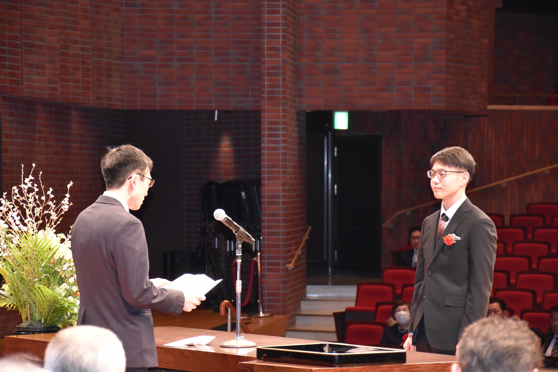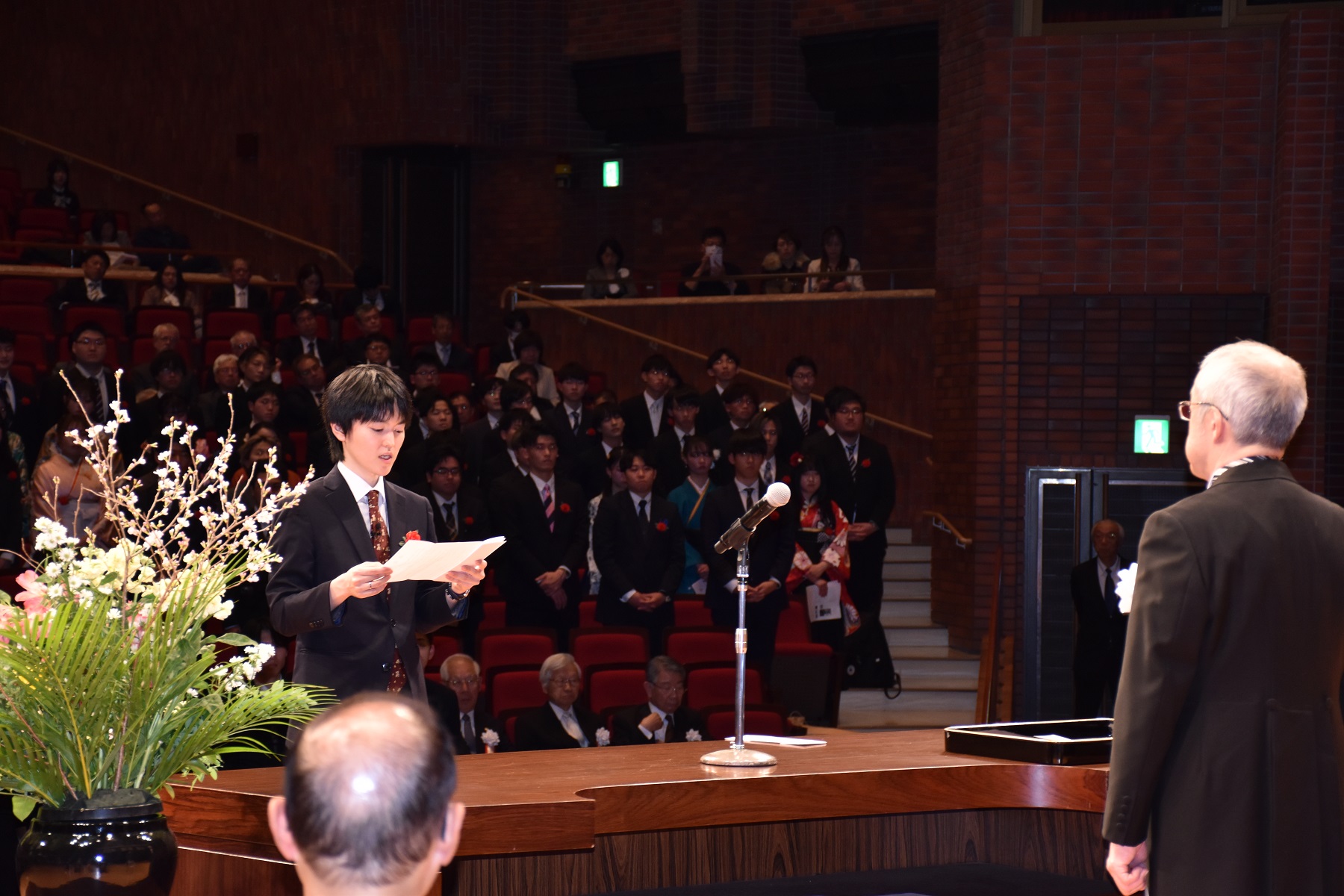 学生表彰者の中から、理工学部情報システム工学科 安住勇哉さんが、卒業生・修了生を代表して答辞を述べ、式は滞りなく終了しました。